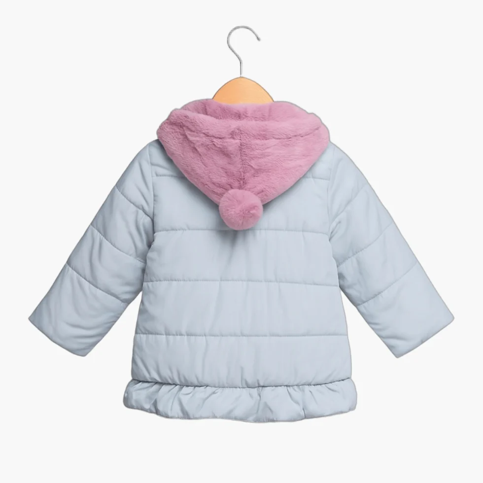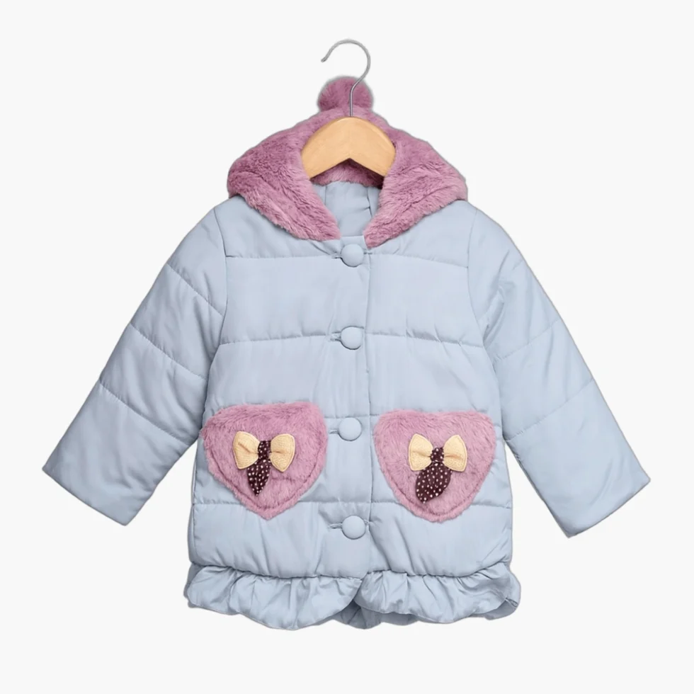 Soft, warm and stylish winter jacket for girls featuring a fur-lined hood and cute heart-shaped pockets with bow detail. Made from premium padded fabric to keep kids cozy during cold weather while ensuring comfort and durability.