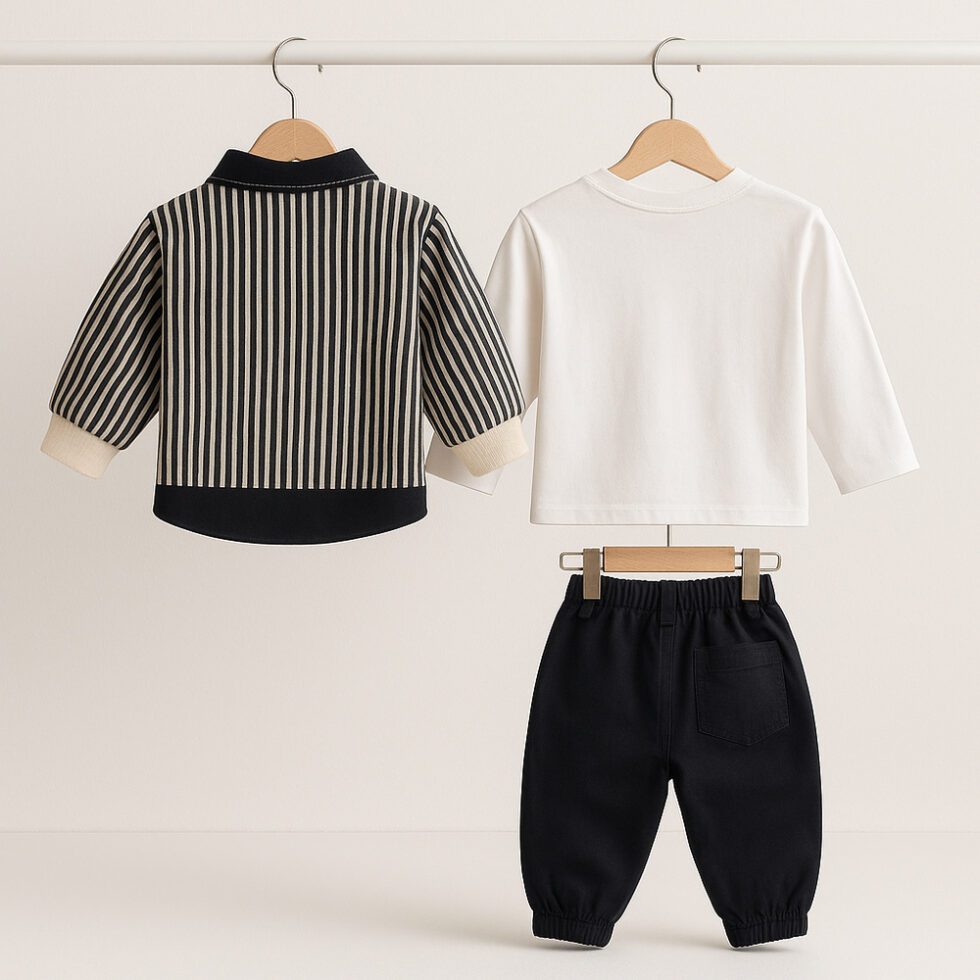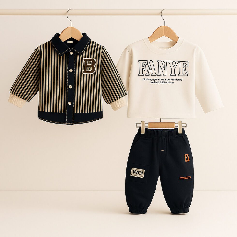 Give your child a smart and stylish look with this premium boys casual clothing set from Salty Pumpkin. This complete kids outfit combo for boys includes a striped shirt, a soft printed tee, and matching jogger pants — perfect for modern everyday fashion.