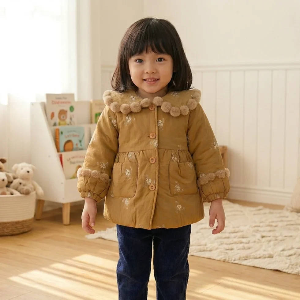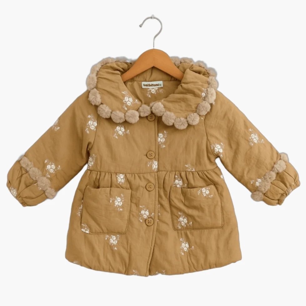Keep your little one warm and stylish this winter with this beautifully designed kids padded jacket. Made from soft, winter-friendly fabric, it provides excellent insulation without feeling heavy. The cute all-over print and fur-trimmed hood add a charming look, while the front button closure ensures easy wearing. Designed for both boys and girls, this jacket is ideal for outings, school, travel, and daily winter wear. A perfect blend of comfort, warmth, and premium style.