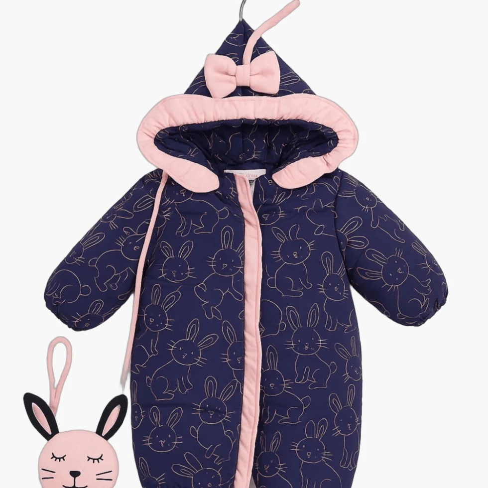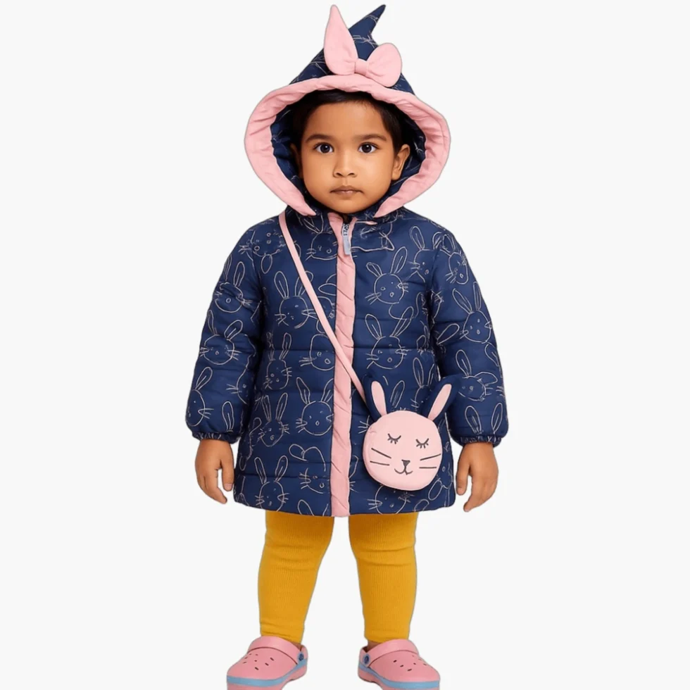 Keep your little one warm, cozy, and cute this winter with our front-open padded winter jacket for boys & girls. Designed with an adorable bunny all-over print, soft hood lining, and warm insulated fabric, this jacket is perfect for cold-weather outings. The stylish bow detail on the hood adds a charming touch, making it both functional and fashionable.