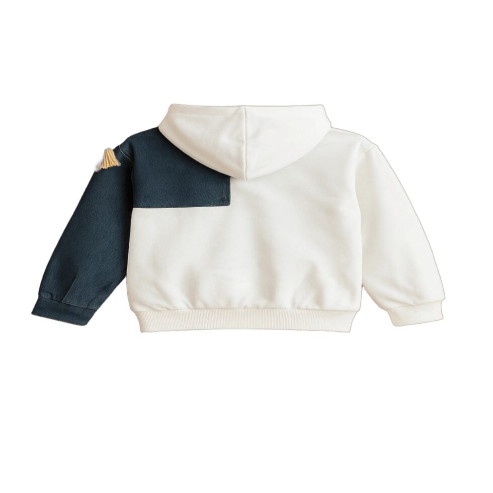 Give your little one a trendy yet cozy look with this stylish baby hooded sweatshirt. Designed with a modern color-block style, this pullover features a soft solid-color body paired with a denim-style patchwork sleeve and chest pocket detail, creating a fashionable layered look in one easy piece.