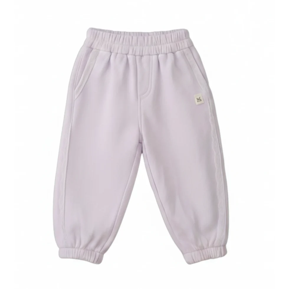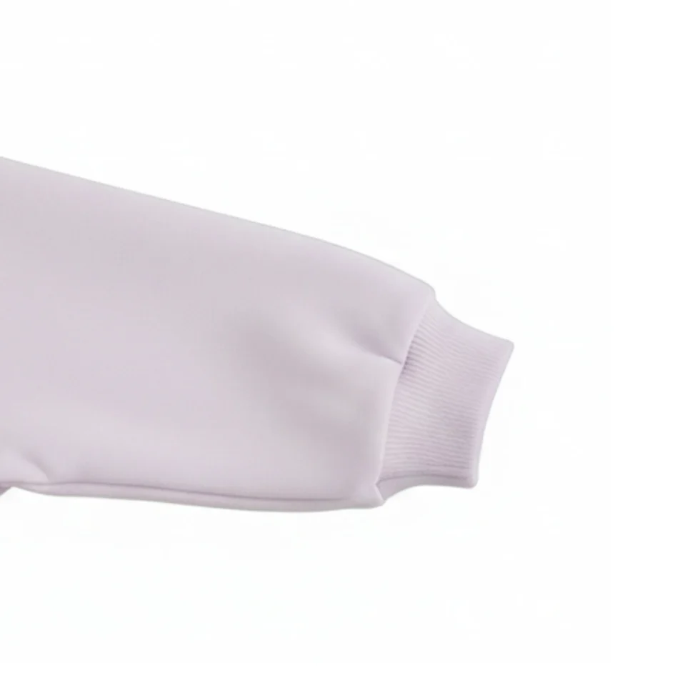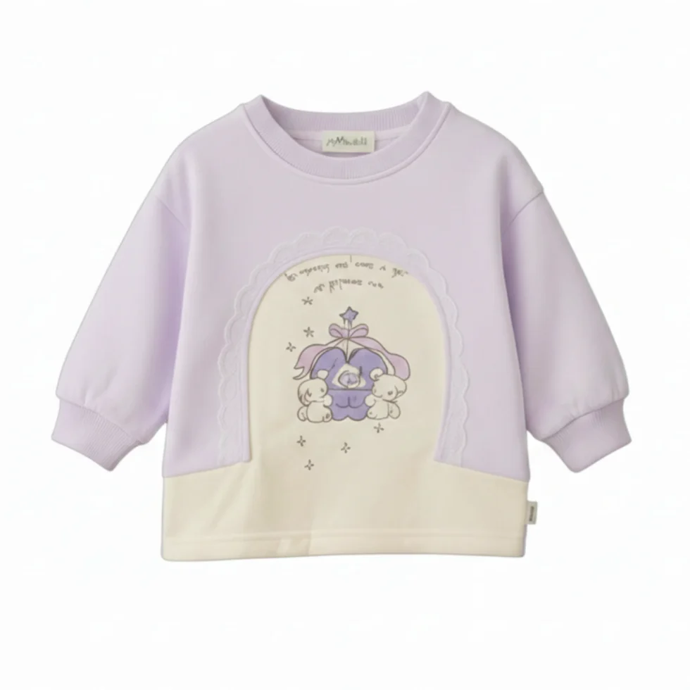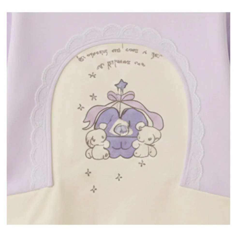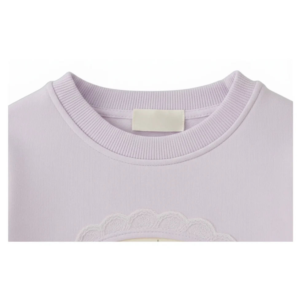The sweatshirt showcases a sweet pastel design with a charming cartoon print and delicate lace-style detailing, adding a playful and stylish touch. The elastic waistband pants provide a secure yet flexible fit, allowing for easy movement during playtime, crawling, or lounging.