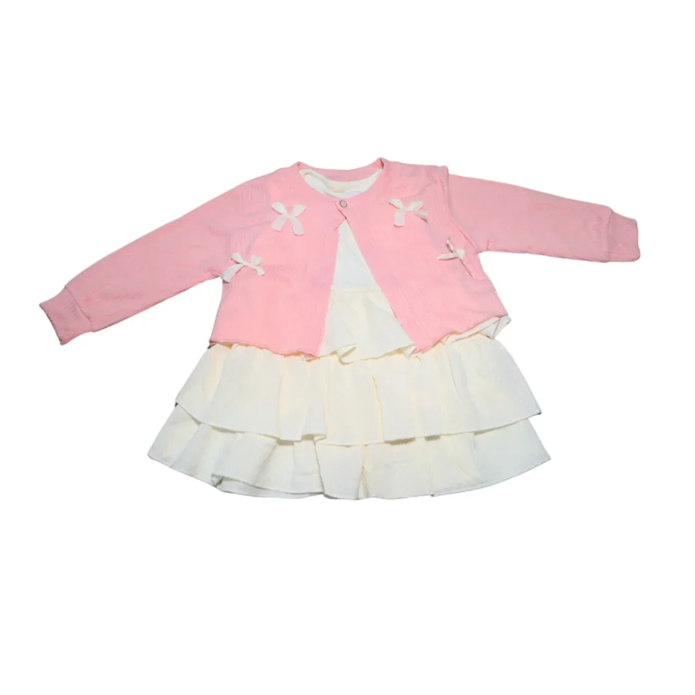 This adorable girls 2 piece dress set is designed to give kids a stylish and comfortable outfit for many occasions. The set includes a beautiful ruffle tiered dress and a matching bow cardigan. Together, they create a charming and playful look that kids love to wear.