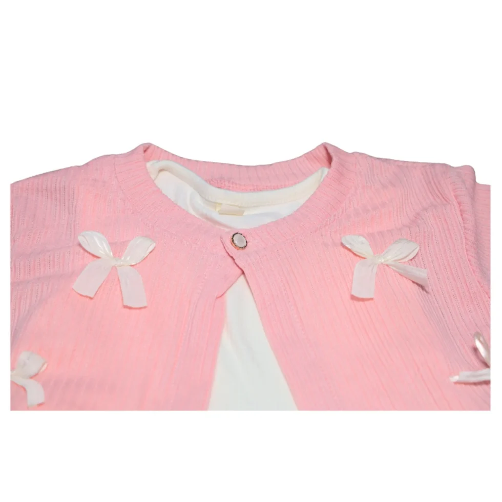 In addition, the matching cardigan adds warmth and completes the outfit. The cardigan includes a cute bow detail that gives the set a sweet and stylish touch. Therefore, this girls dress with cardigan outfit looks fashionable while still being practical for kids.