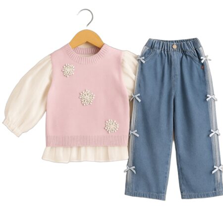 Toddler Girls Outfit Set – Puff Sleeve Blouse with Flower Knit Vest and Bow Detail Denim Pants, Cute Casual 2-Piece Clothing Set for Kids